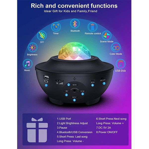 علاوه بر این ترکیب نورپردازی کهکشانی با اسپیکر بلوتوث باعث شده این مدل فقط یک چراغ خواب ساده نباشد. در نتیجه شما با یک محصول چندکاره روبهرو هستید که هم برای استراحت، هم سرگرمی و هم دکوراسیون کاربرد دارد.